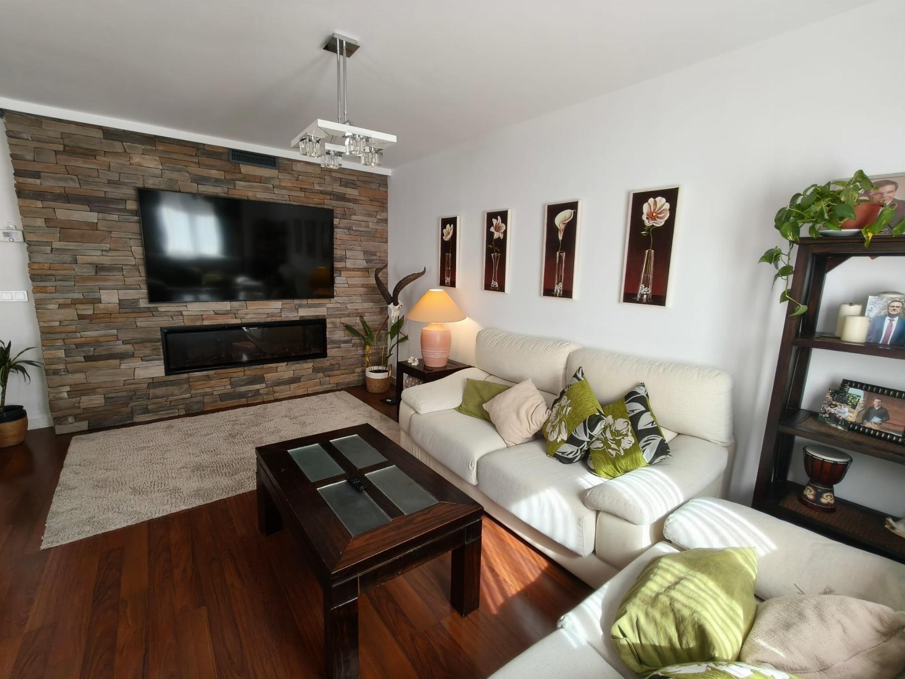 Salón comedor de unos 30 metros cuadrados con chimenea efecto llama debajo de la televisión con acceso a un balcón, cocina totalmente equipada de capricho con espacio para comer con galería de unos 12 metros cuadrados, 3 dormitorios(1 dormitorio de matrimonio, 1 habitación sencilla y 1 habitación doble), 2 baños uno de ellos en suite, trastero de 5 metros y garaje y otra plaza de garaje opcional por 30.000 € adicionales